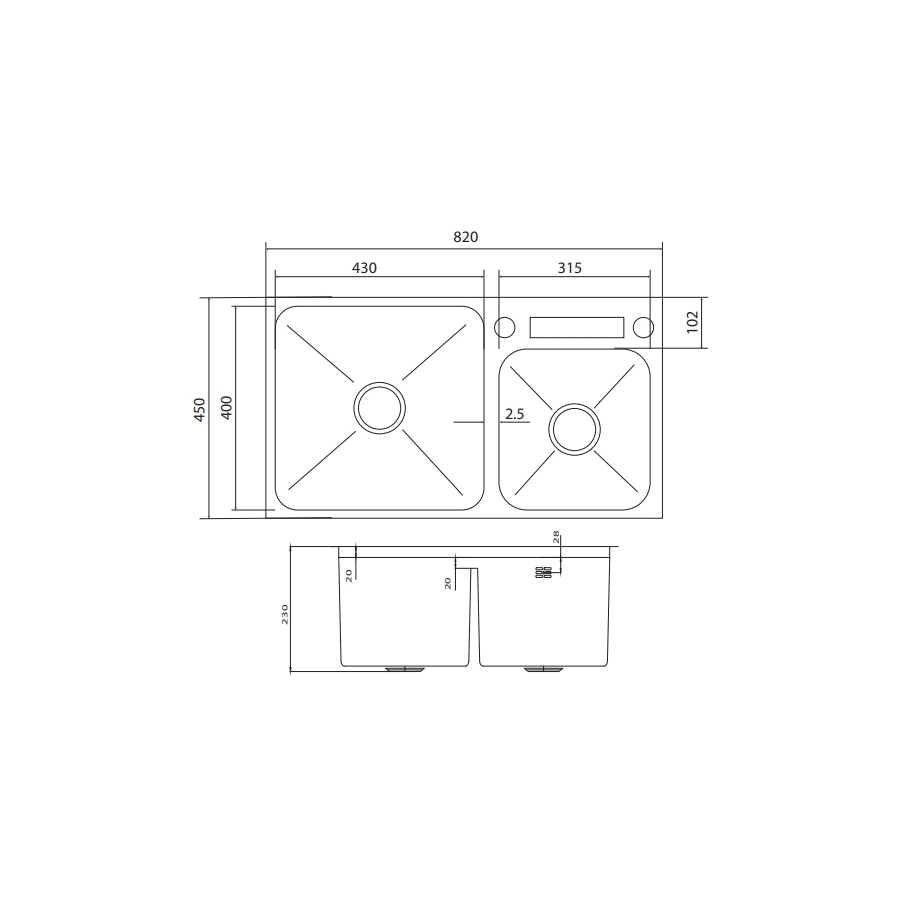 - Thiết kế 2 hố hình chữ nhật kích thước 390x400 mm, 345x348mm