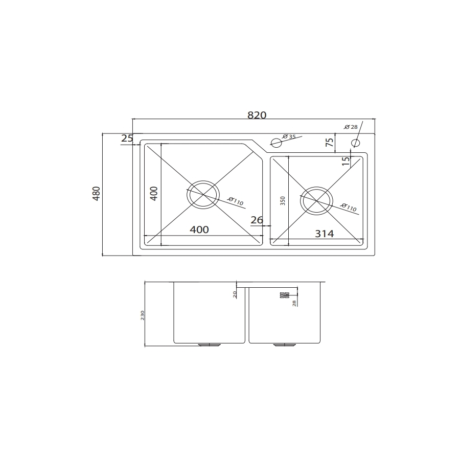 Thiết kế 2 hố với thước 400*400 và 314*350 mm