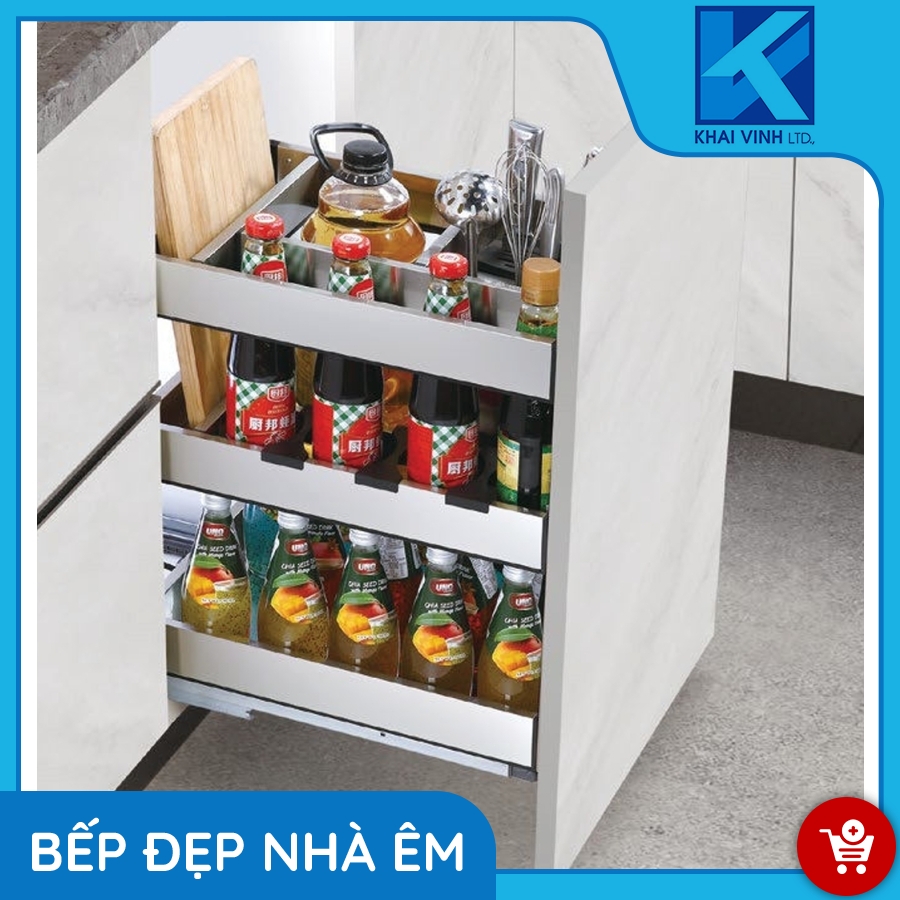 Kệ đựng gia vị có hệ thống ray giảm chấn chuyển động nhẹ nhàng, êm ái, giảm tiếng ồn trong không gian bếp một cách hiệu quả.