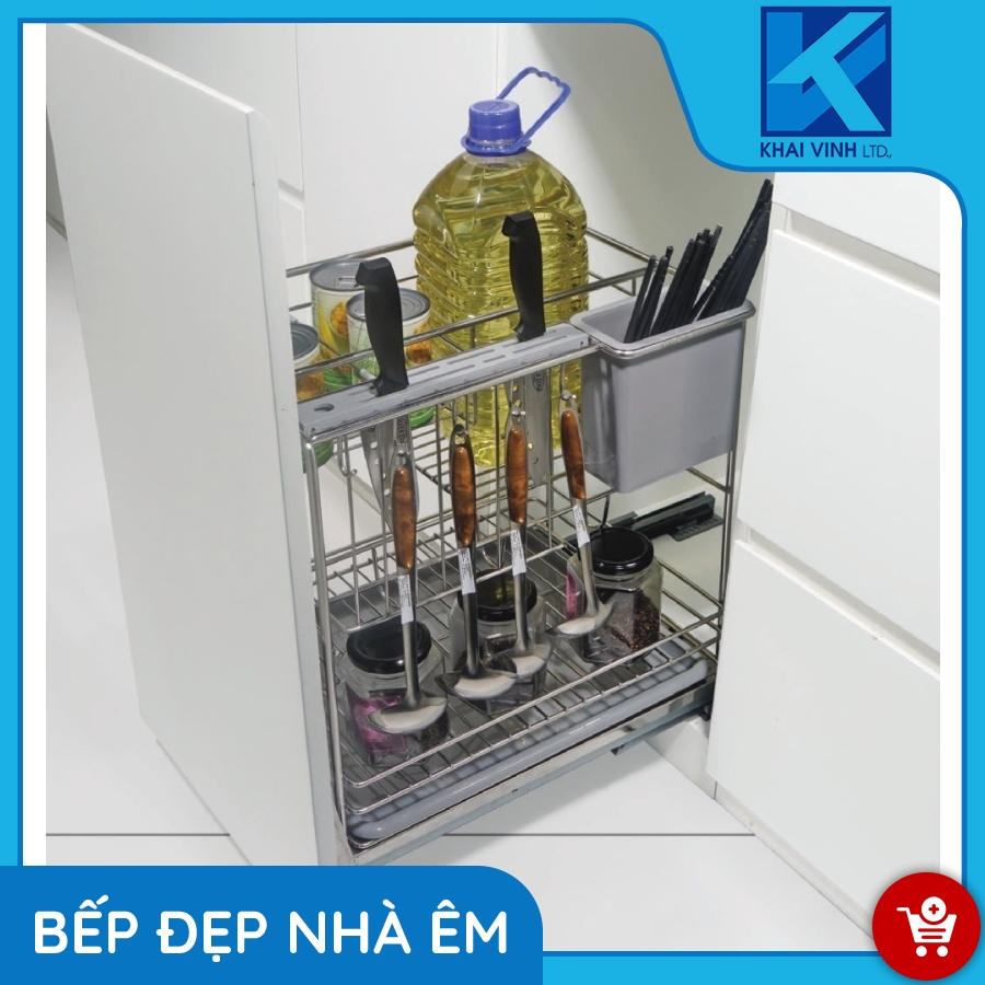Được thiết kế gồm hai tầng, đựng được nhiều chai lọ gia vị có kích thước và chiều cao khác nhau.